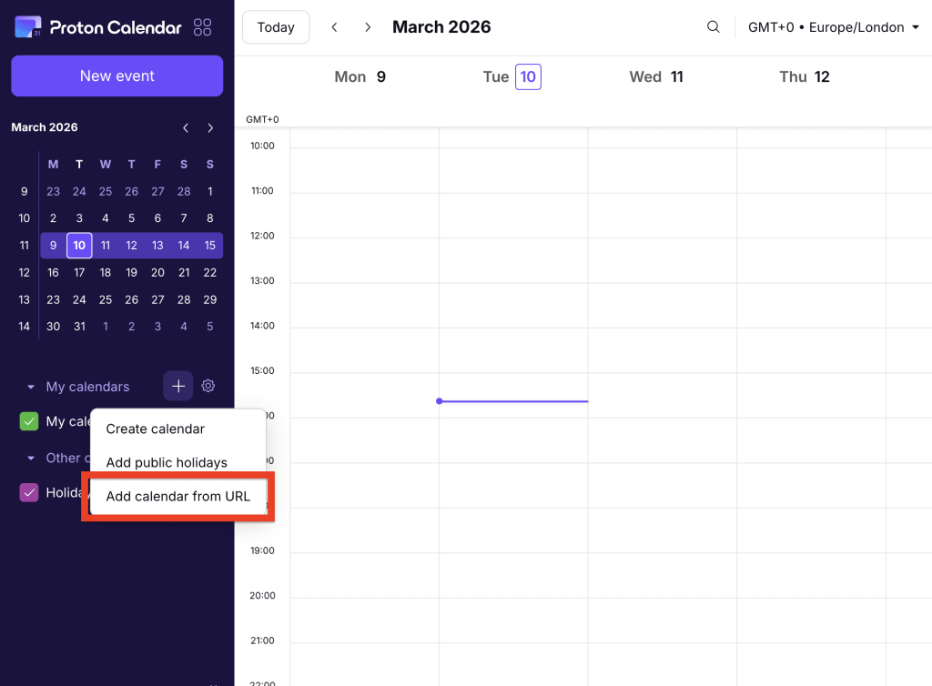 You can also quickly subscribe to a calendar from the Proton Calendar home page. Just Click the + button next to My Calendars, then select Add calendar from URL from the dropdown menu.