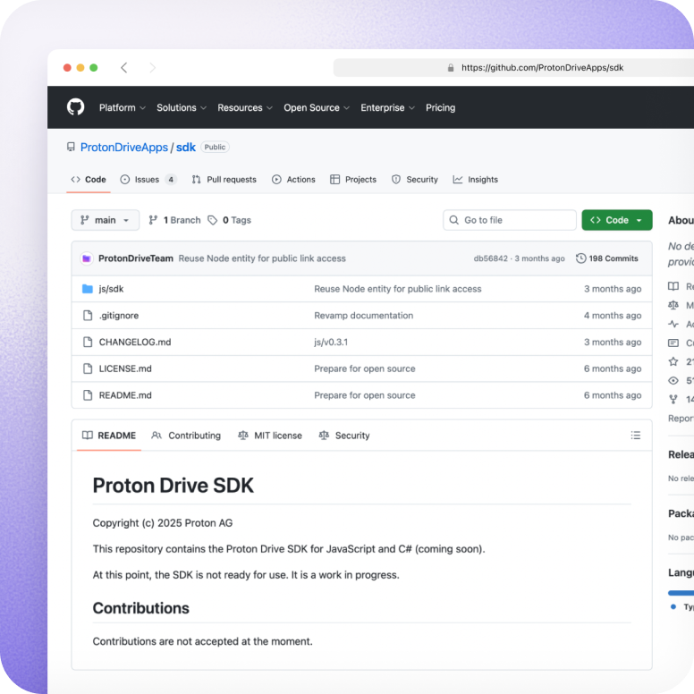 This year, we launched a C# SDK for Proton Drive, which supported performance upgrades for our new macOS app. We’re also developing a JavaScript SDK for web apps, available to preview on GitHub(new window).
