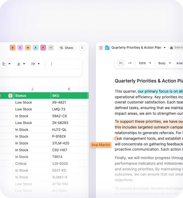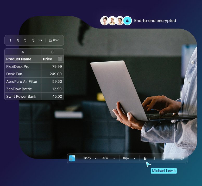 Your files are securely stored in the cloud. Open, edit, and share Docs and Sheets from any device — whether you're traveling, working from home, or using your mobile on the go.