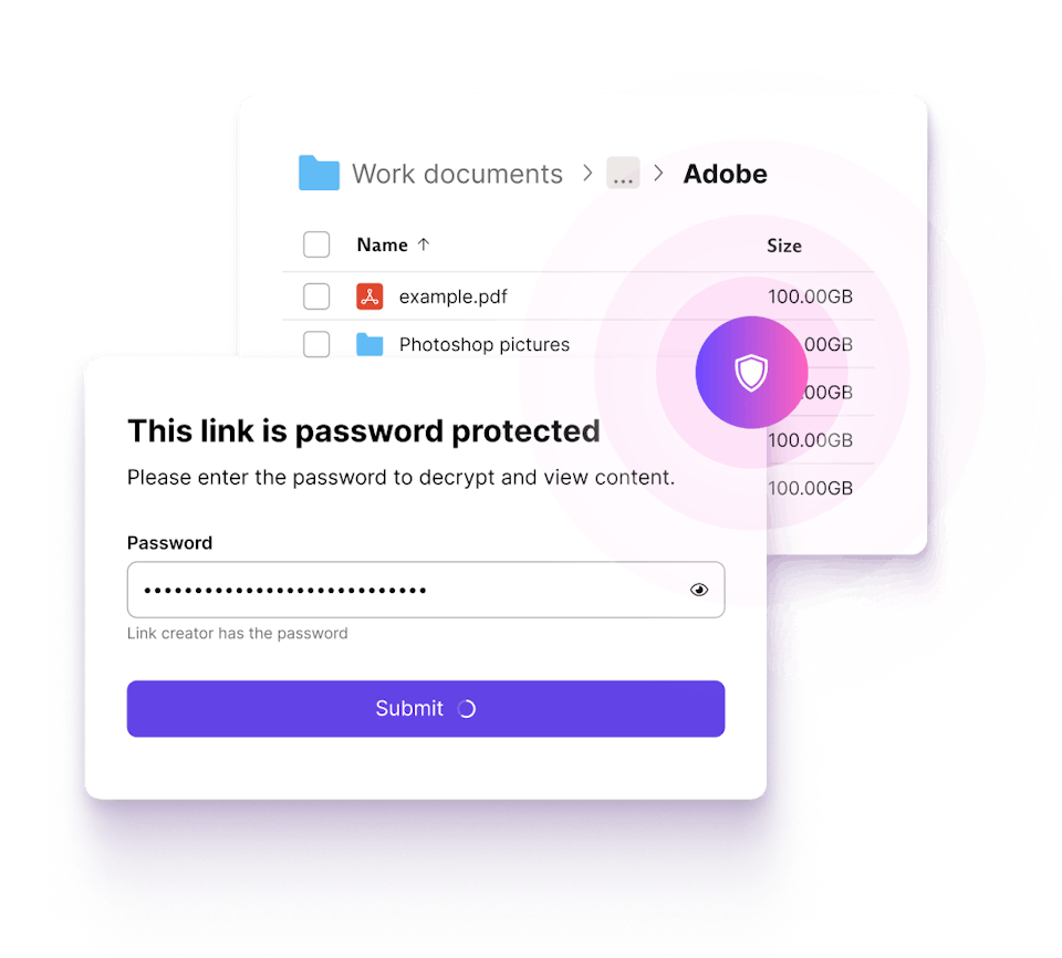 End-to-end encryption ensures that no one, not even us, can access your files. Files, file names, folder names, and more, are all fully encrypted at rest and in transit to the secure cloud.