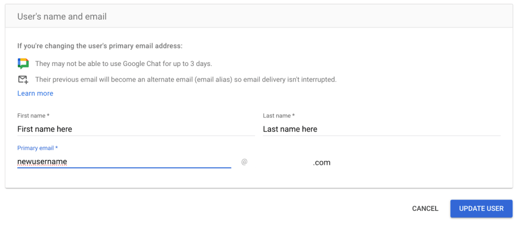 - Enter a new first and last name for the user, followed by a new email username. Note that the email domain will remain the same. For example, if your old email address is oldusername@business.com, your new email address will appear like this: newusername@business.com.