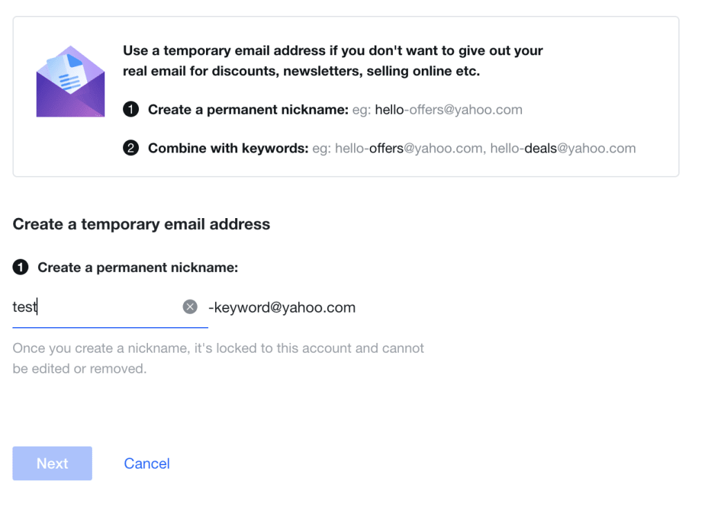 - Finally, create a keyword to use with your permanent nickname. If you’re using a disposable account to sign up for newsletters, for example, your keyword could be “newsletters.”