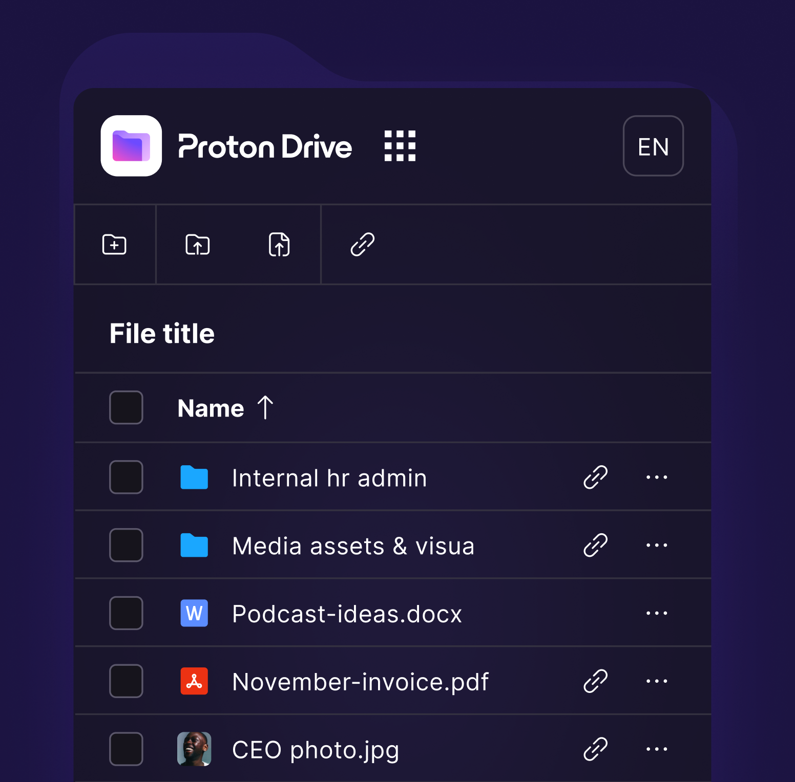 Cargue el logotipo de su empresa en Proton Drive para crear un espacio de trabajo profesional y cohesivo que sea realmente suyo.