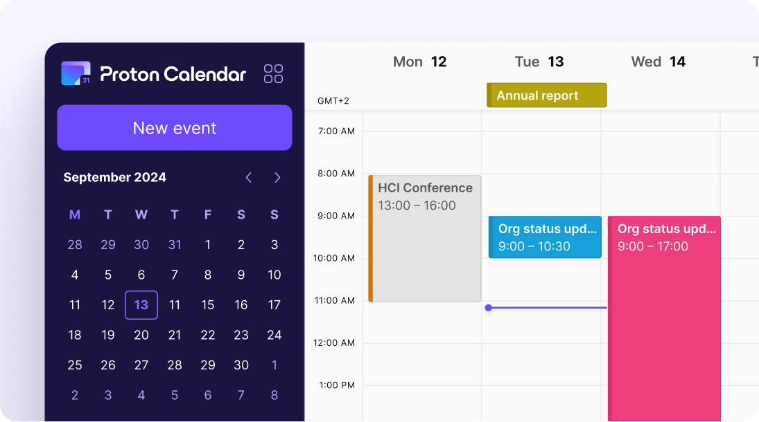 Mantenga sus planes en privado y perfectamente organizados con Proton Calendar. Comparta fácilmente su calendario con sus familiares o compañeros de trabajo.