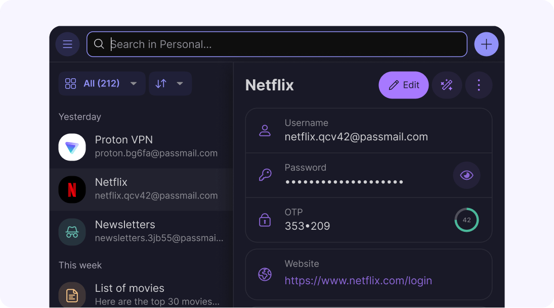Cree, almacene y rellene automáticamente sus credenciales de inicio de sesión de forma segura en servicios de streaming, aplicaciones bancarias o sitios web de compras con Proton Pass.