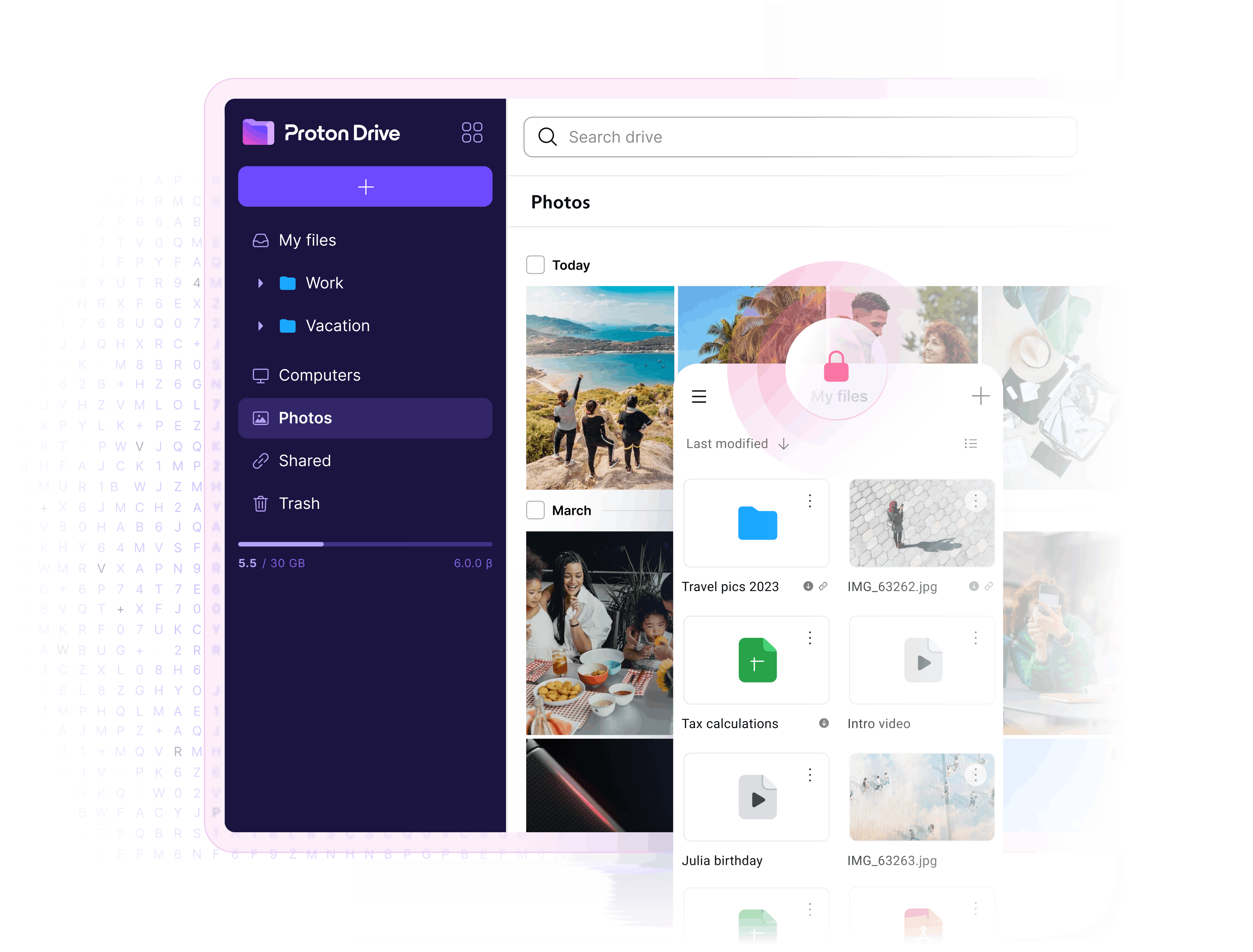 Almacene de forma segura todas las fotos y documentos de su familia en Proton Drive para poder acceder a ellos desde cualquier lugar y en cualquier momento.