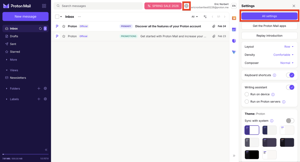 - Sign in at account.proton.me and open your account settings (Settings ⚙️ → All settings).
