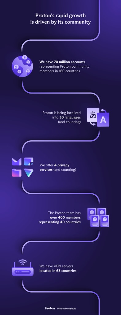 Recently, Proton passed 70 million user accounts, demonstrating the widespread interest in privacy-first technologies that are better for users and society. Your support has allowed Proton Mail to become the world’s largest secure email service(ventana nueva) and Proton VPN to become the most-used free VPN service(ventana nueva) in many countries around the world, particularly in places where freedom of information is needed the most, such as in Russia. Best of all, we have been able to do this while preserving Proton’s original values from our earliest crowdfunding days. Proton continues to be free, open source, neutral, independent, and community first. Your support is essential to protecting Proton’s values as it has allowed us to grow to a team of over 400 that can serve you better while remaining financially sustainable.