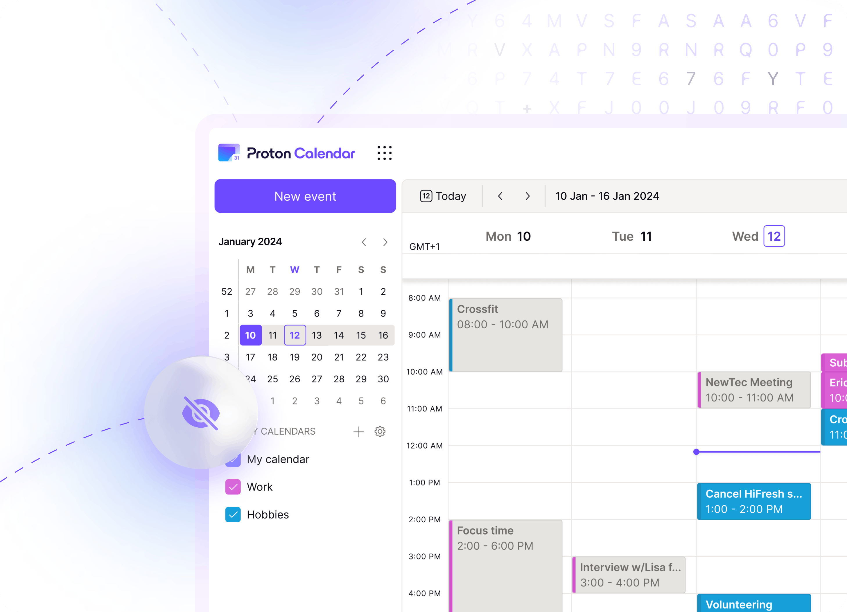 El calendario es el cuaderno de bitácora de tu vida y de tus contactos, y contiene por ello algunos de tus datos más confidenciales. Proton Calendar es la solución ideal para mantenerlos seguros en todo momento.