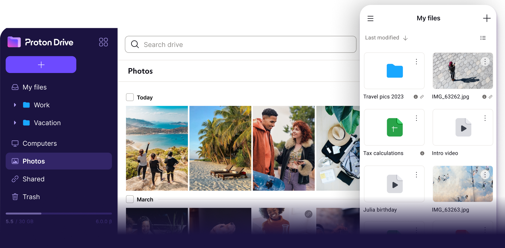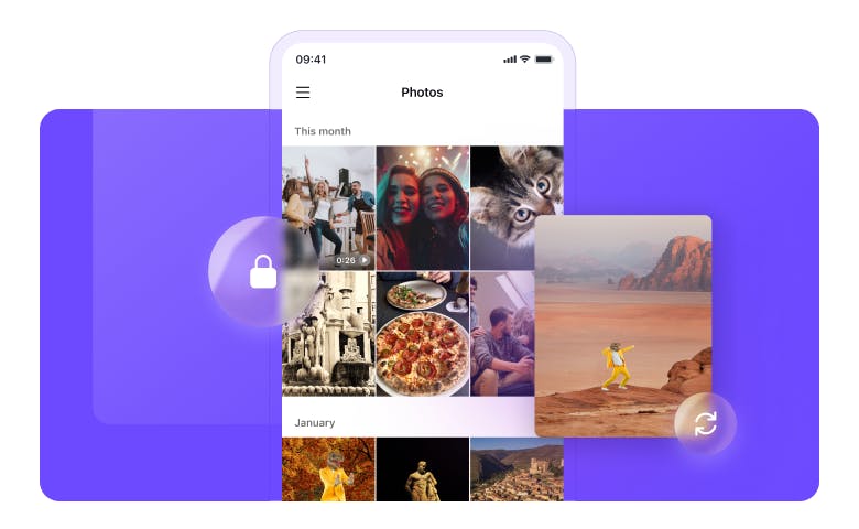Proton Drive’s mobile apps automatically back up your photos in their original resolution and let you share securely. Access them anywhere, even offline.
