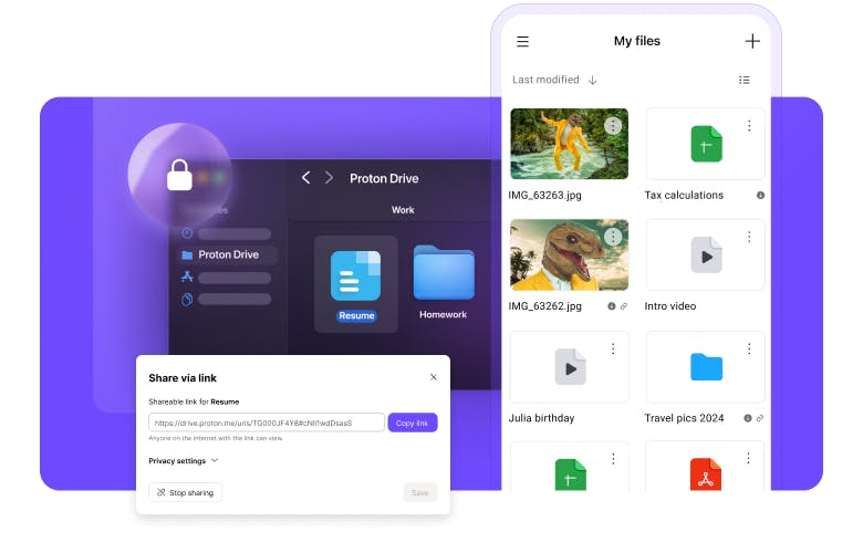 Proton Drive gives you an encrypted vault to store and access your files on any device. Unlike Google Drive or Dropbox, Proton Drive protects your data with end-to-end encryption — so your files, including metadata, stay private.