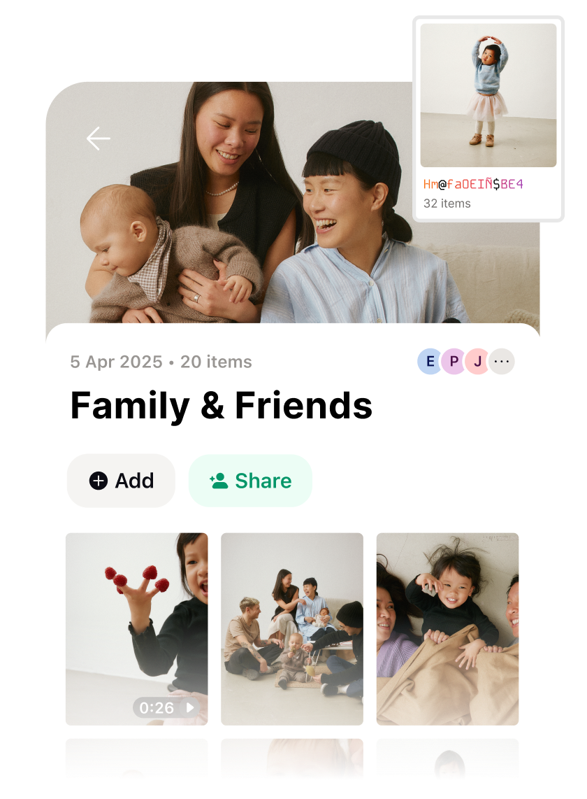 Keep family memories in the family. Send photos and videos to loved ones and set passwords or expiration dates to ensure those moments stay between you and the people you trust.