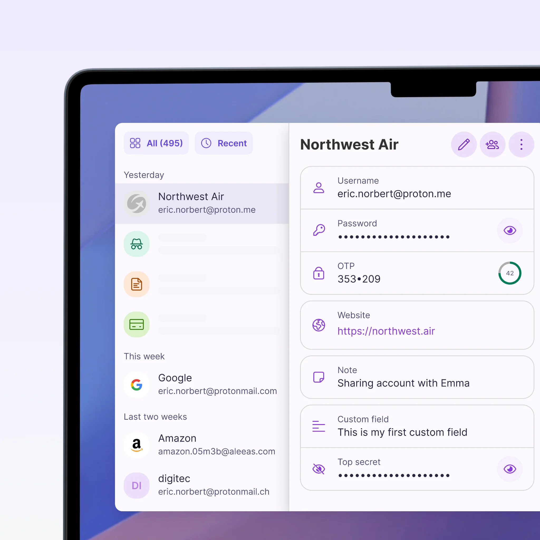 Générez et stockez des mots de passe forts avec un gestionnaire de mots de passe qui se synchronise automatiquement sur tous vos appareils et vous alerte en cas de fuite de données.