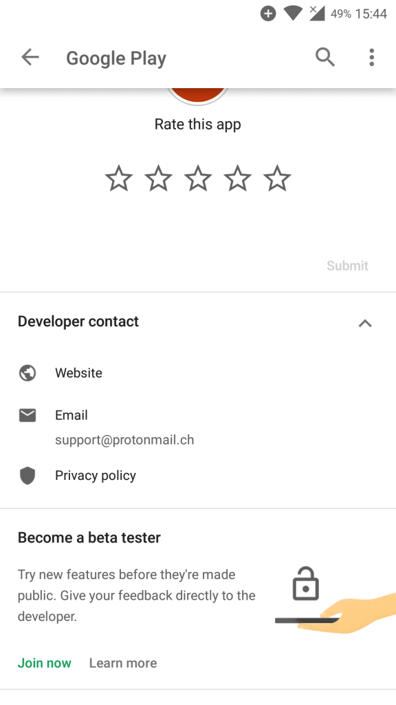 To use the Proton Mail beta on your Android device, go to the Proton Mail app in Google Play(nouvelle fenêtre). Scroll to the developer contact on the page and tap the “Join Now” button under the “Become a beta tester” section.