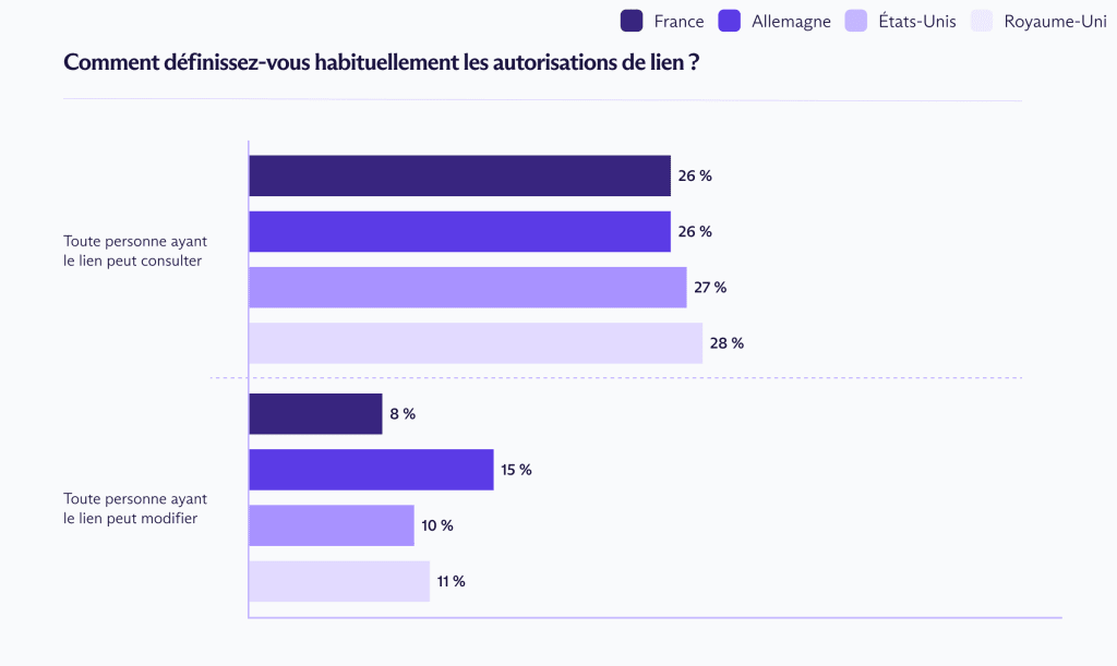 L’accès fantôme est un sous-produit de la façon dont les équipes collaborent. Sur tous les marchés, 26 à 28 % des répondants ont déclaré partager des feuilles de calcul en utilisant « toute personne disposant du lien peut consulter ». 7 à 15 % supplémentaires utilisent « toute personne disposant du lien peut modifier ».