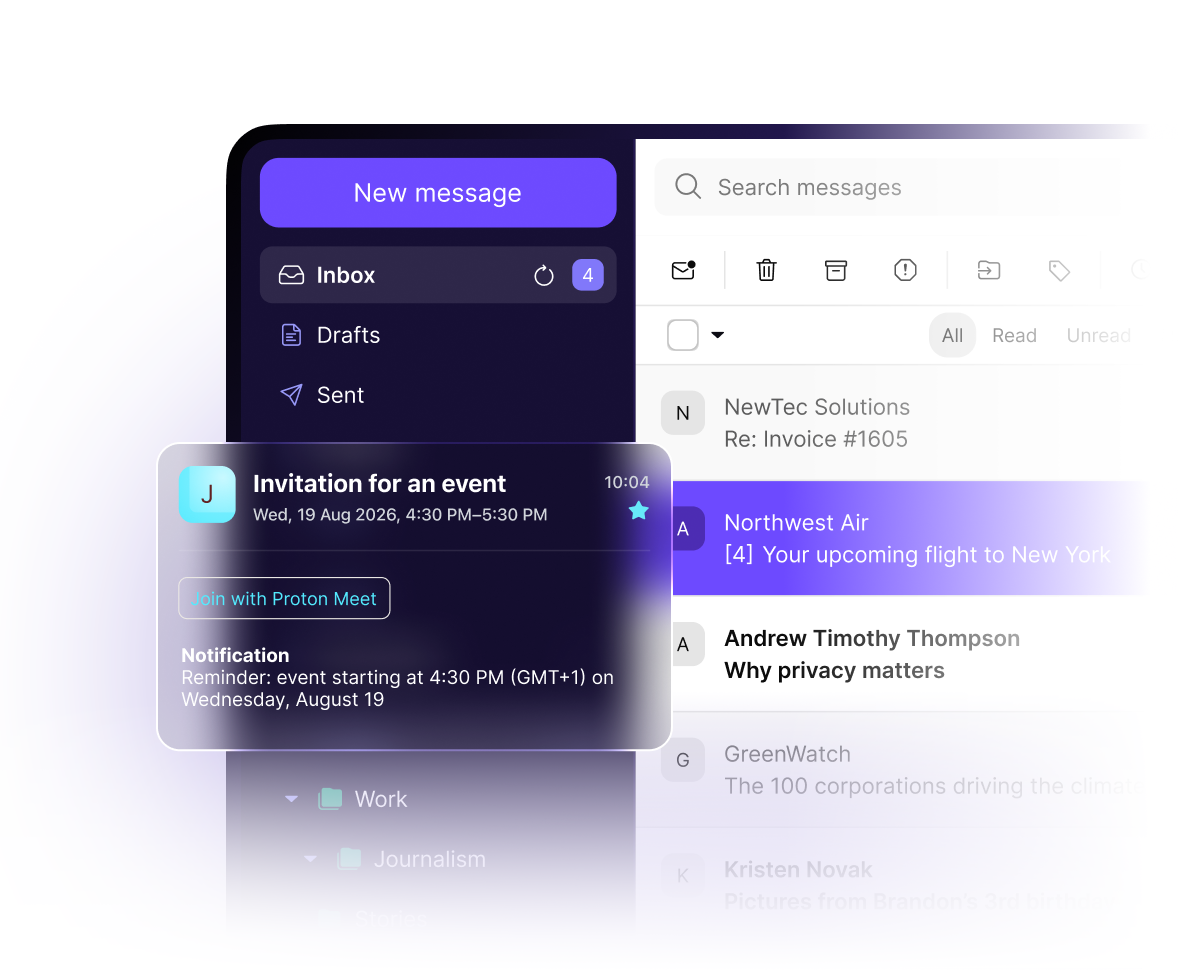 Protégez les communications de votre entreprise avec une adresse e-mail et un calendrier chiffrés et faciles à utiliser. Restez privé, restez conforme.