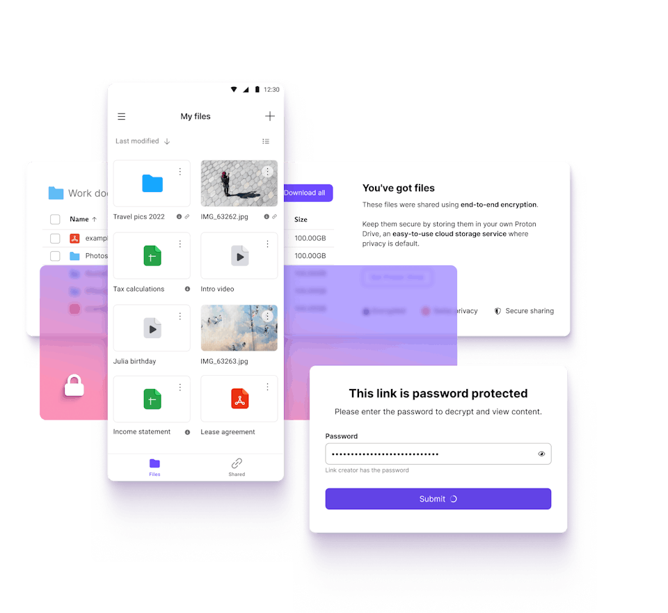 Stockez et partagez en toute sécurité des fichiers de toute taille ou de tout type, qu'il s'agisse de documents financiers ou de souvenirs de vacances. Proton Drive vous permet de garder le contrôle avec des mots de passe, des liens qui expirent et la possibilité de révoquer l'accès à tout moment.