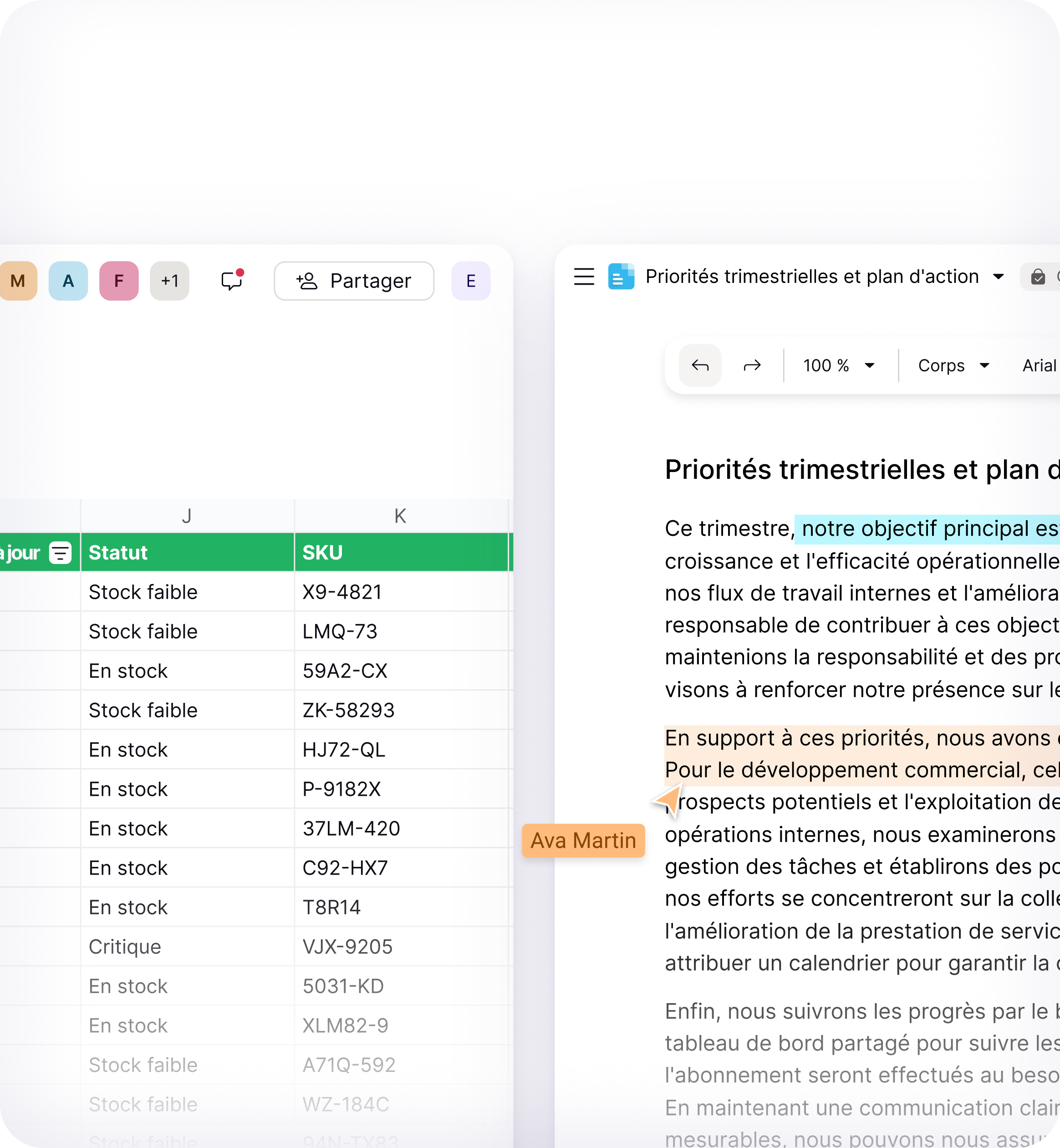 Docs et Sheets dans Proton Drive vous permettent de collaborer sur des documents et des feuilles de calcul en temps réel sans compromettre le respect de la vie privée. Chaque frappe est chiffrée de bout en bout, ainsi votre travail ne sera jamais analysé, partagé ou monétisé.