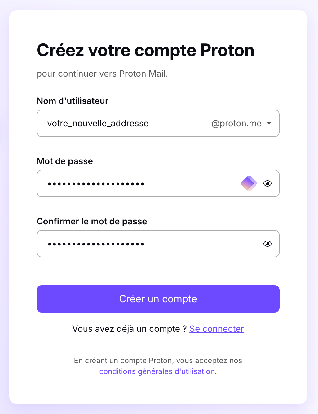 1. Cliquez ici pour créer un compte Proton Mail gratuitement. Choisissez une adresse email et un mot de passe de votre choix.