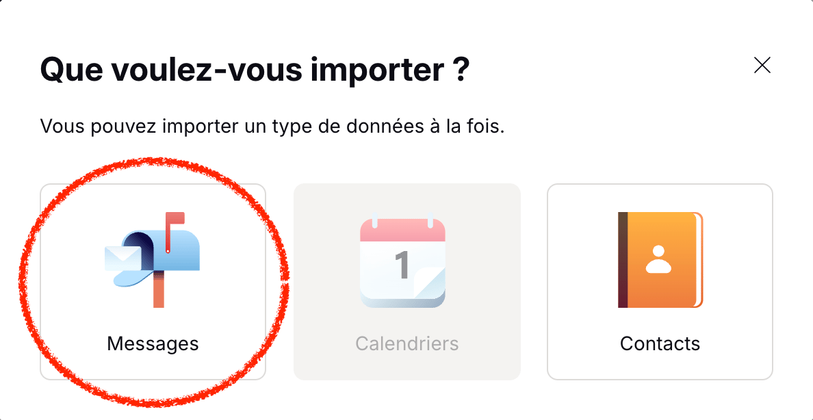 5. Choisissez “Messages” dans l’écran “Que voulez-vous importer ?”, puis Continuer.