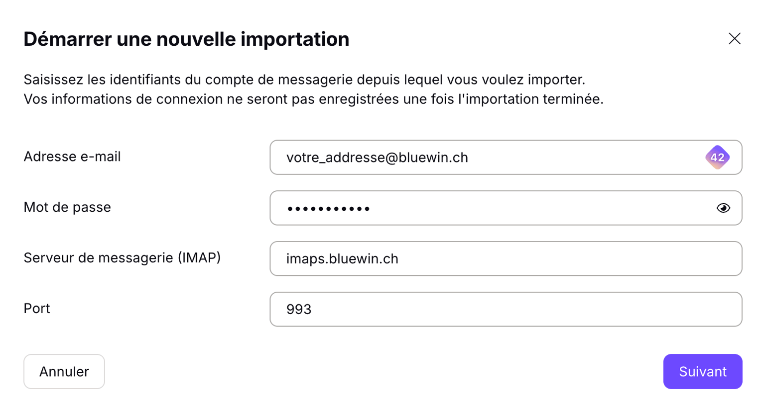 - Serveur de messagerie (IMAP): imaps.bluewin.ch