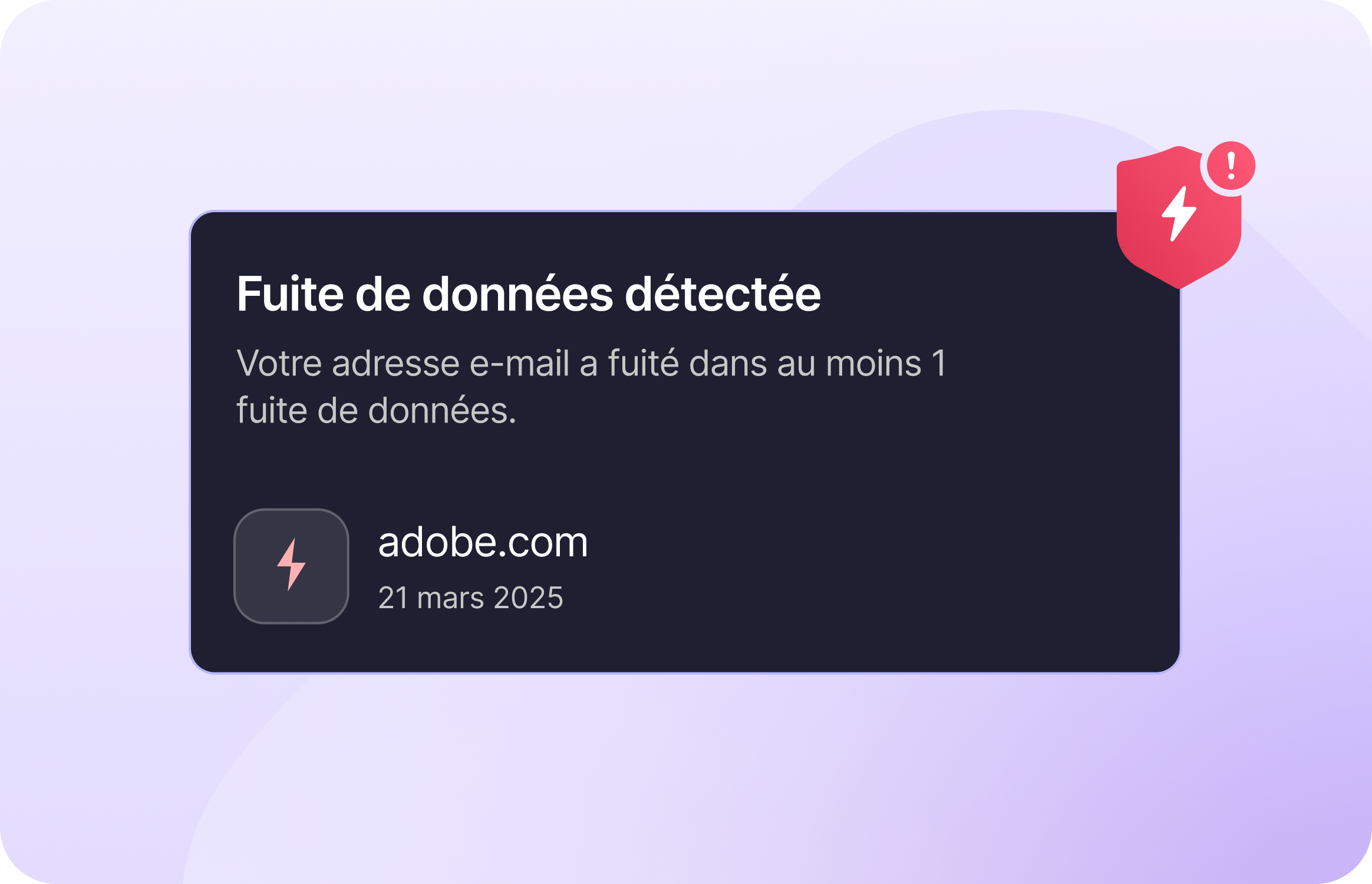 Recevez des alertes immédiates si vos informations personnelles sont compromises lors d'une fuite de données tierce. Vous pouvez surveiller plusieurs adresses e-mail ou votre propre nom de domaine.