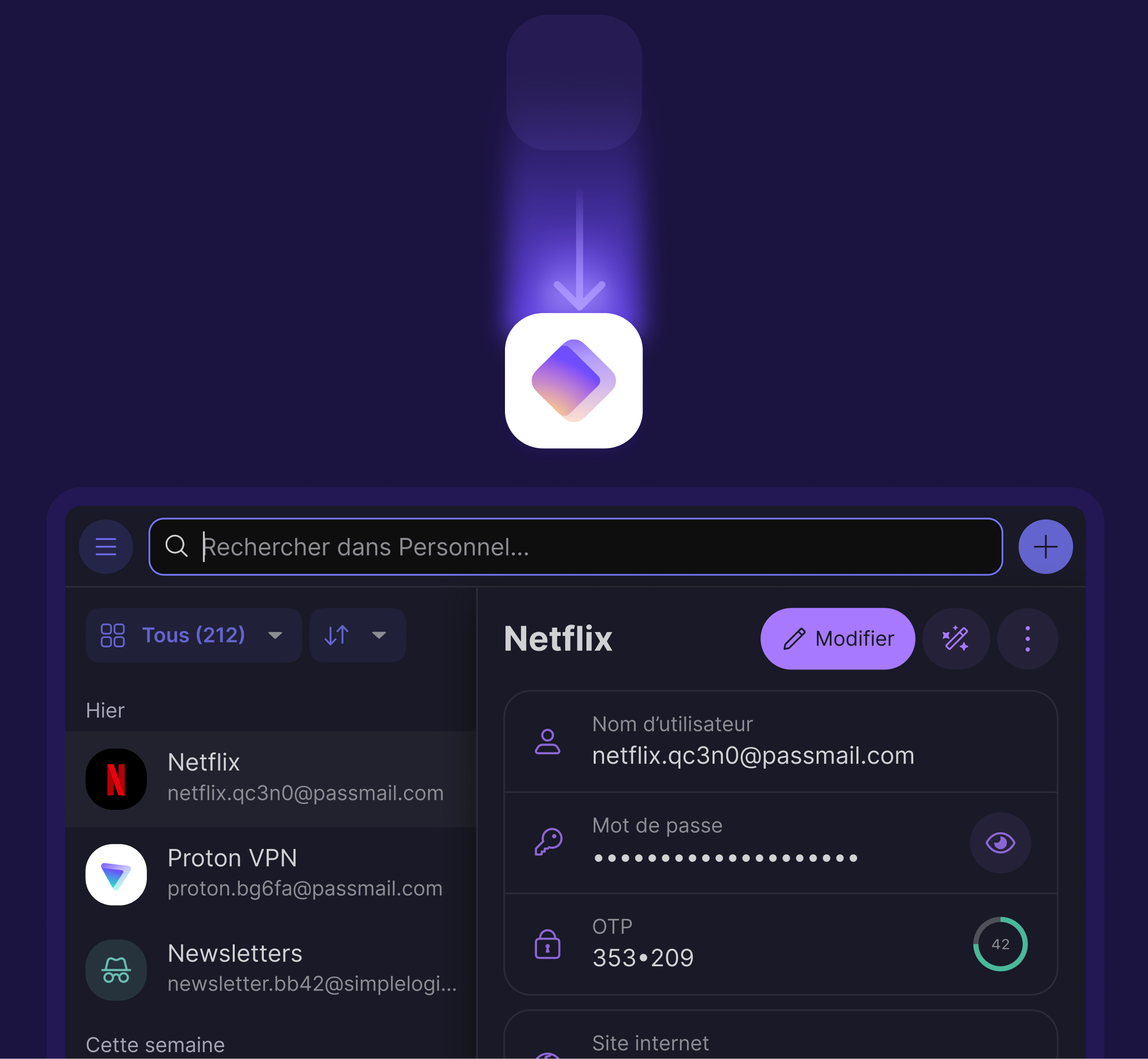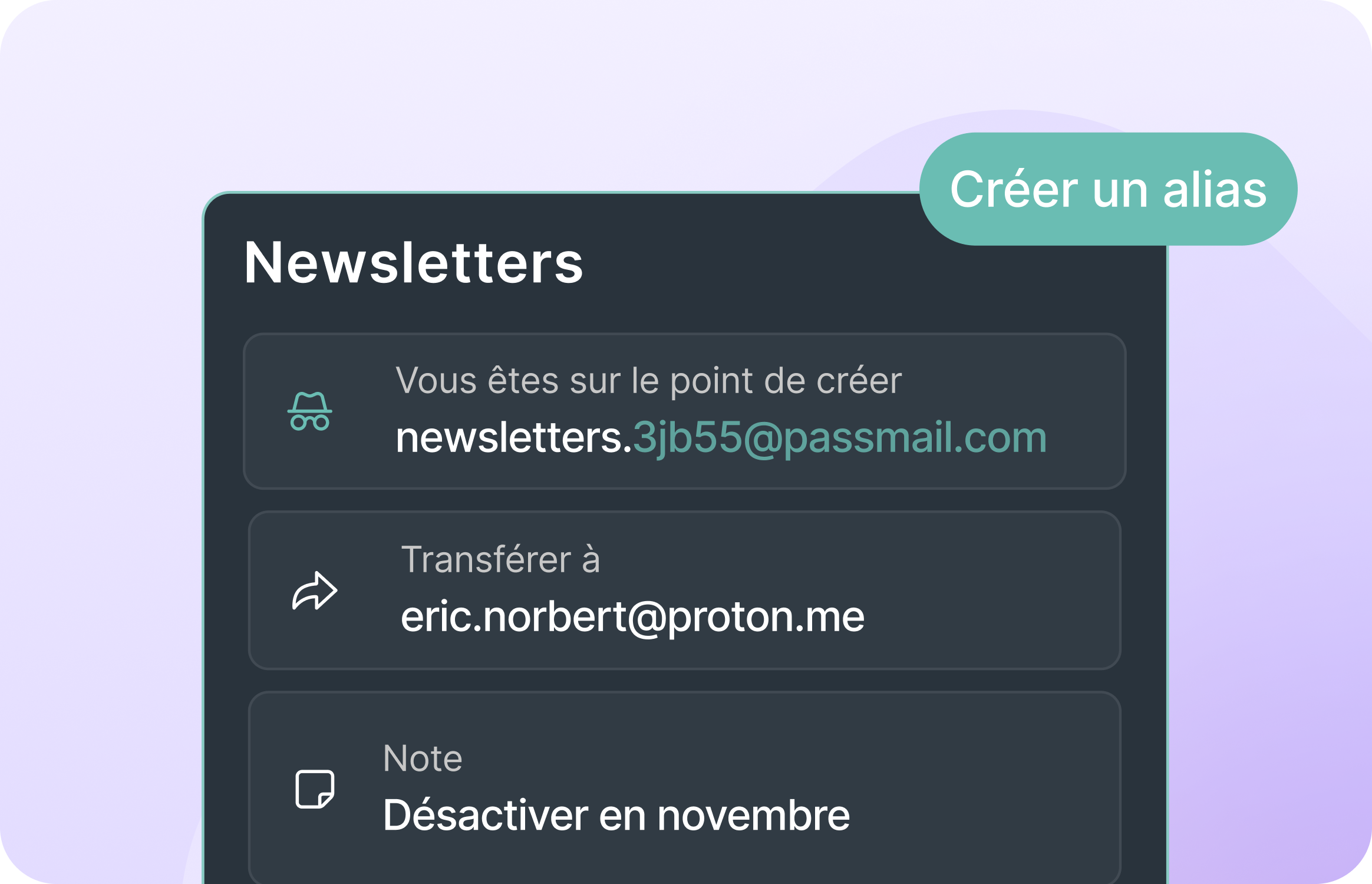 En plus de conserver vos identifiants, Proton Pass protège votre identité grâce à une fonctionnalité intégrée d'alias d'e-mail.