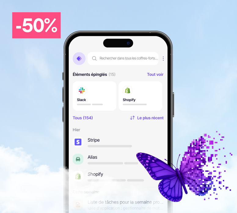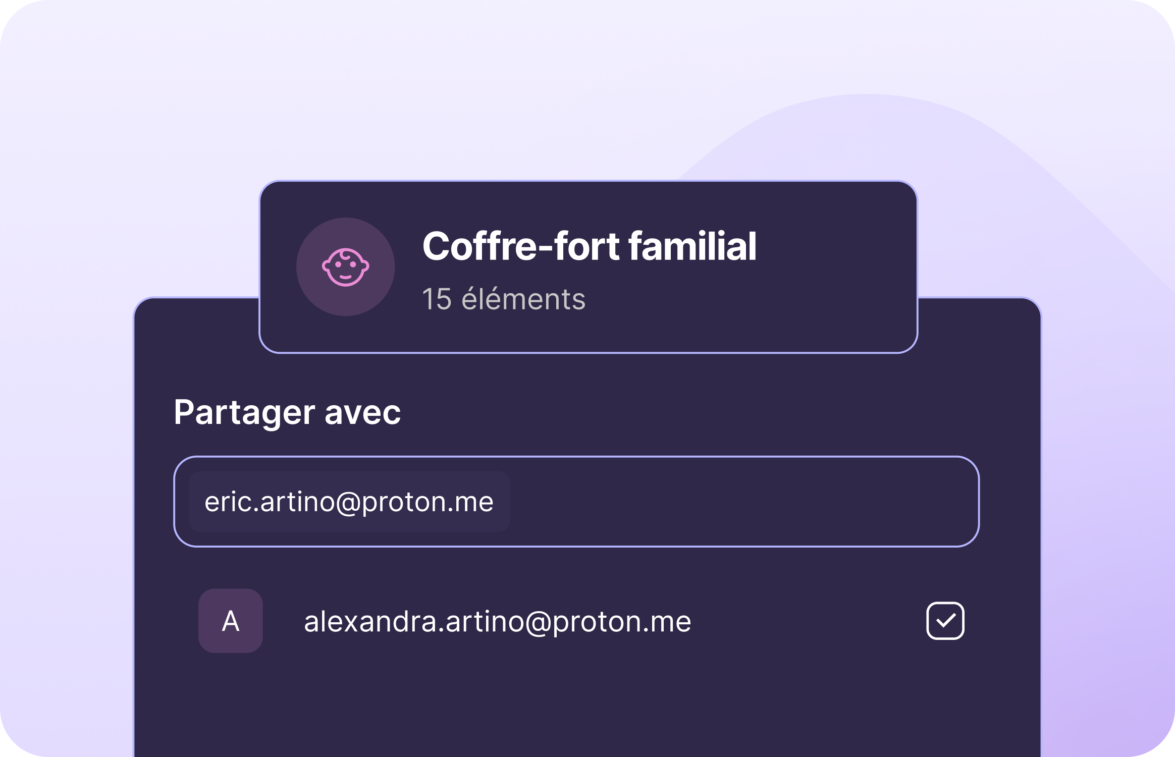 Partagez facilement des informations sensibles avec toute personne, même si elle n'utilise pas Proton Pass. Vous pouvez partager des éléments individuels tels que des mots de passe, des notes ou des cartes de paiement, ou un coffre-fort complet.