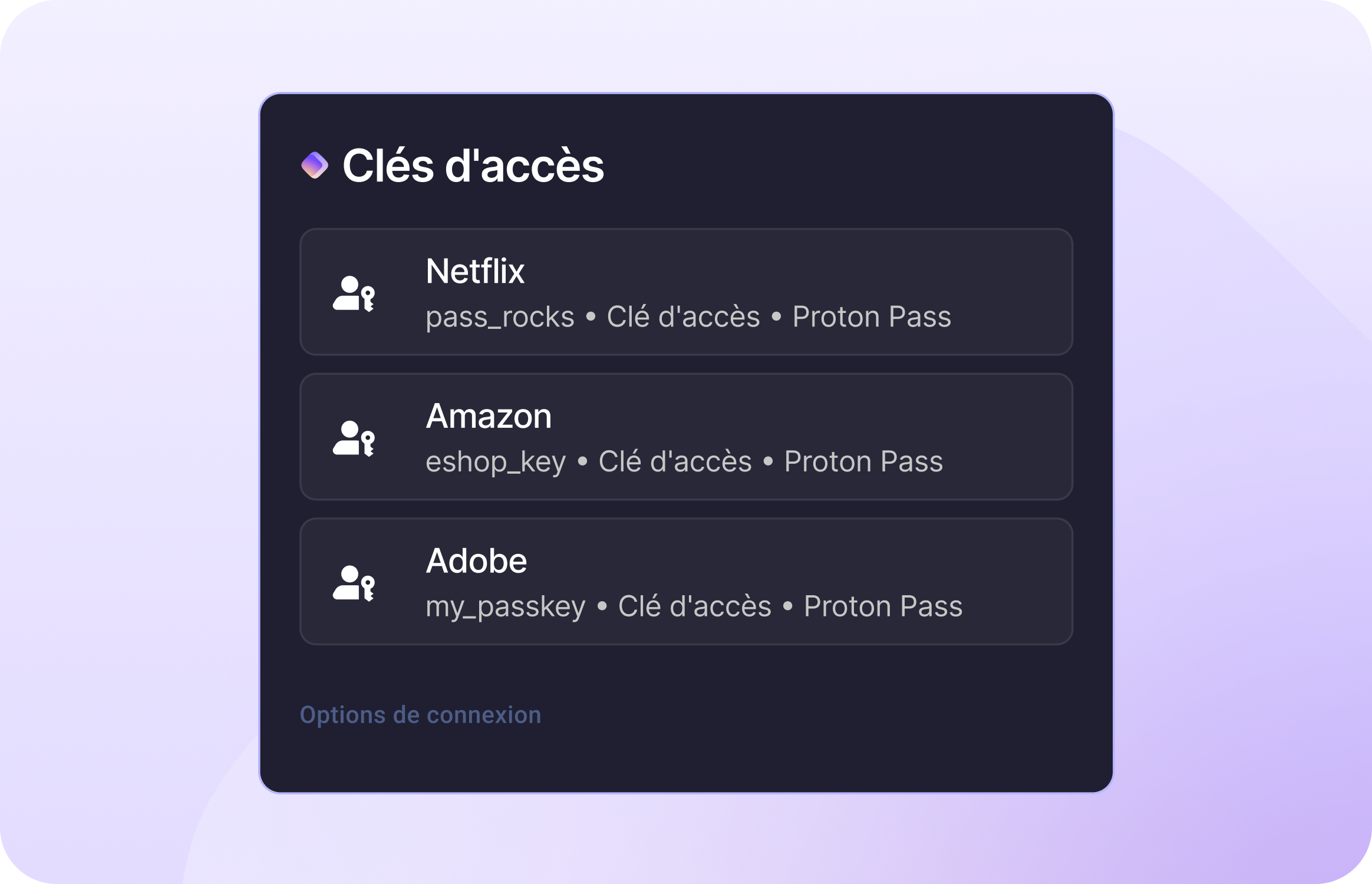 Alternative simple et sécurisée aux mots de passe traditionnels, les clés d'accès empêchent les attaques par hameçonnage et facilitent votre expérience en ligne. Proton Pass prend en charge les clés d'accès sur toutes les plateformes.