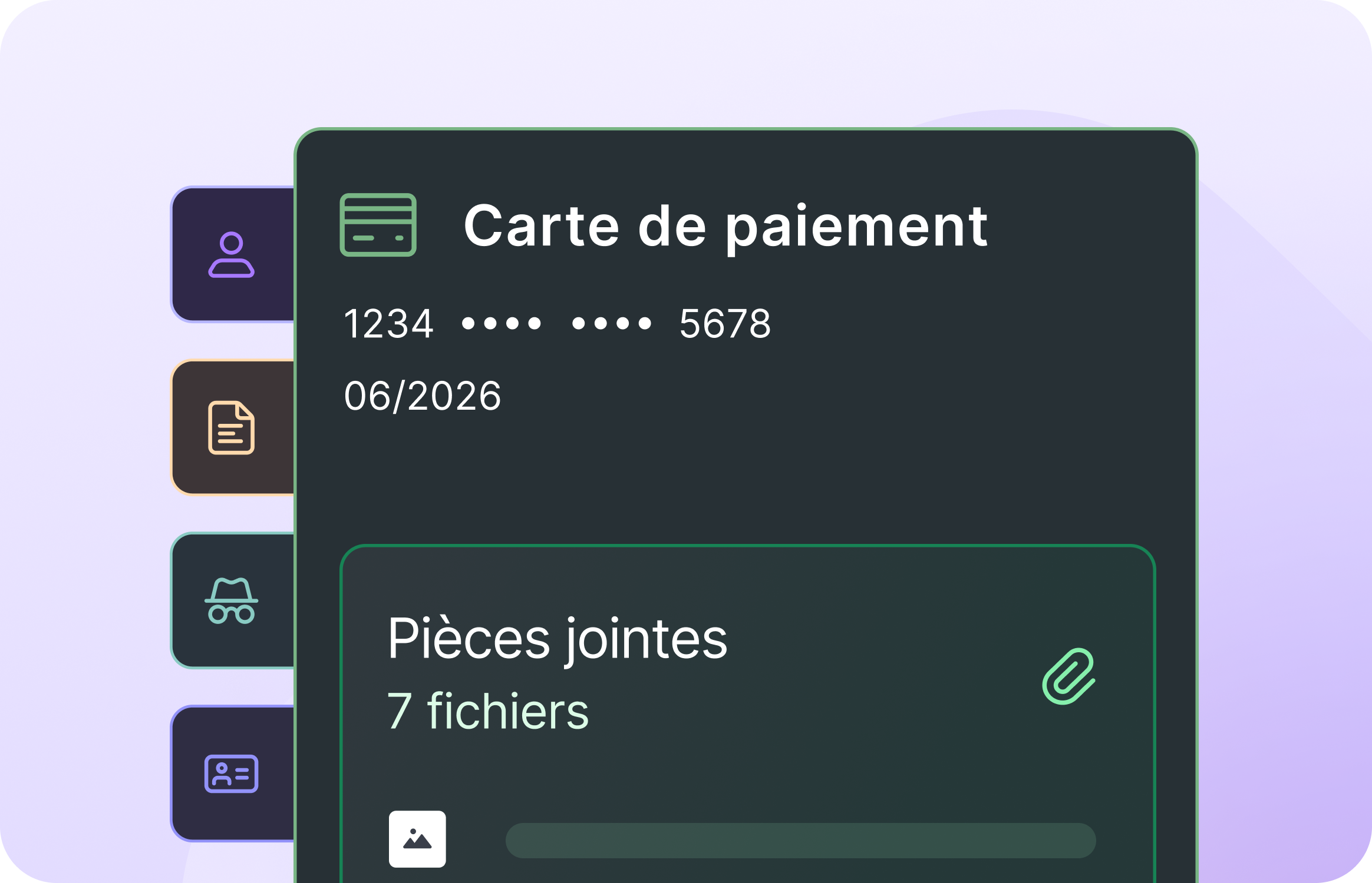 Organisez et simplifiez votre vie numérique. Lorsque vous créez un mot de passe, une identité ou une note dans Proton Pass, vous pouvez également joindre des fichiers, ce qui vous permet de stocker toutes les informations pertinentes pour un compte spécifique dans un endroit sécurisé.