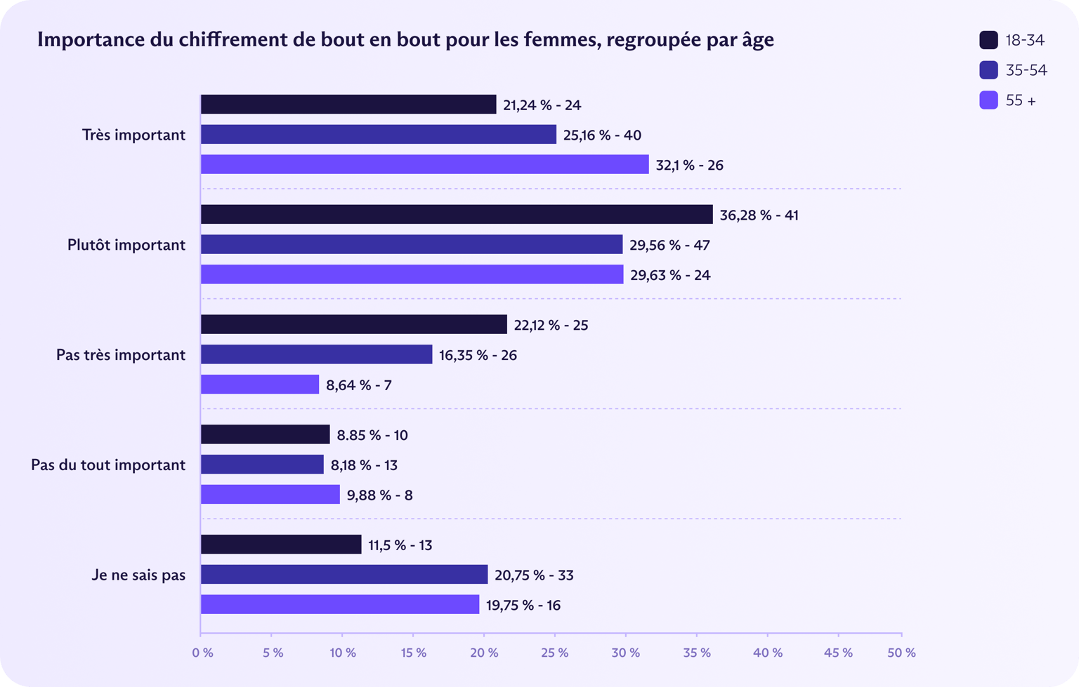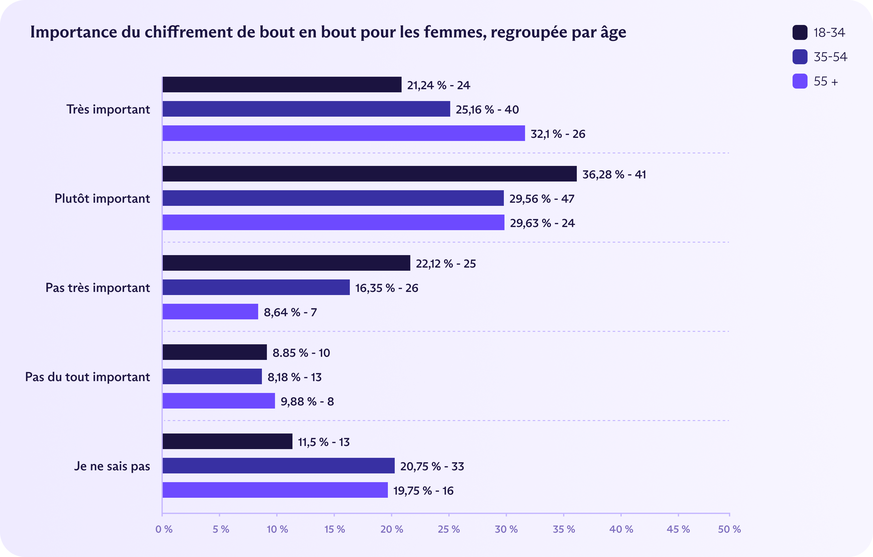À titre de comparaison, 47 % des Allemands considèrent le chiffrement de bout en bout comme très important, suivis par 42 % des Américains et 38 % des Britanniques. Le pourcentage global de Français jugeant le chiffrement de bout en bout « très important » ou « assez important » (61 %) est également le plus faible, derrière l'Allemagne (78 %), les États-Unis (76 %) et le Royaume-Uni (73 %).
