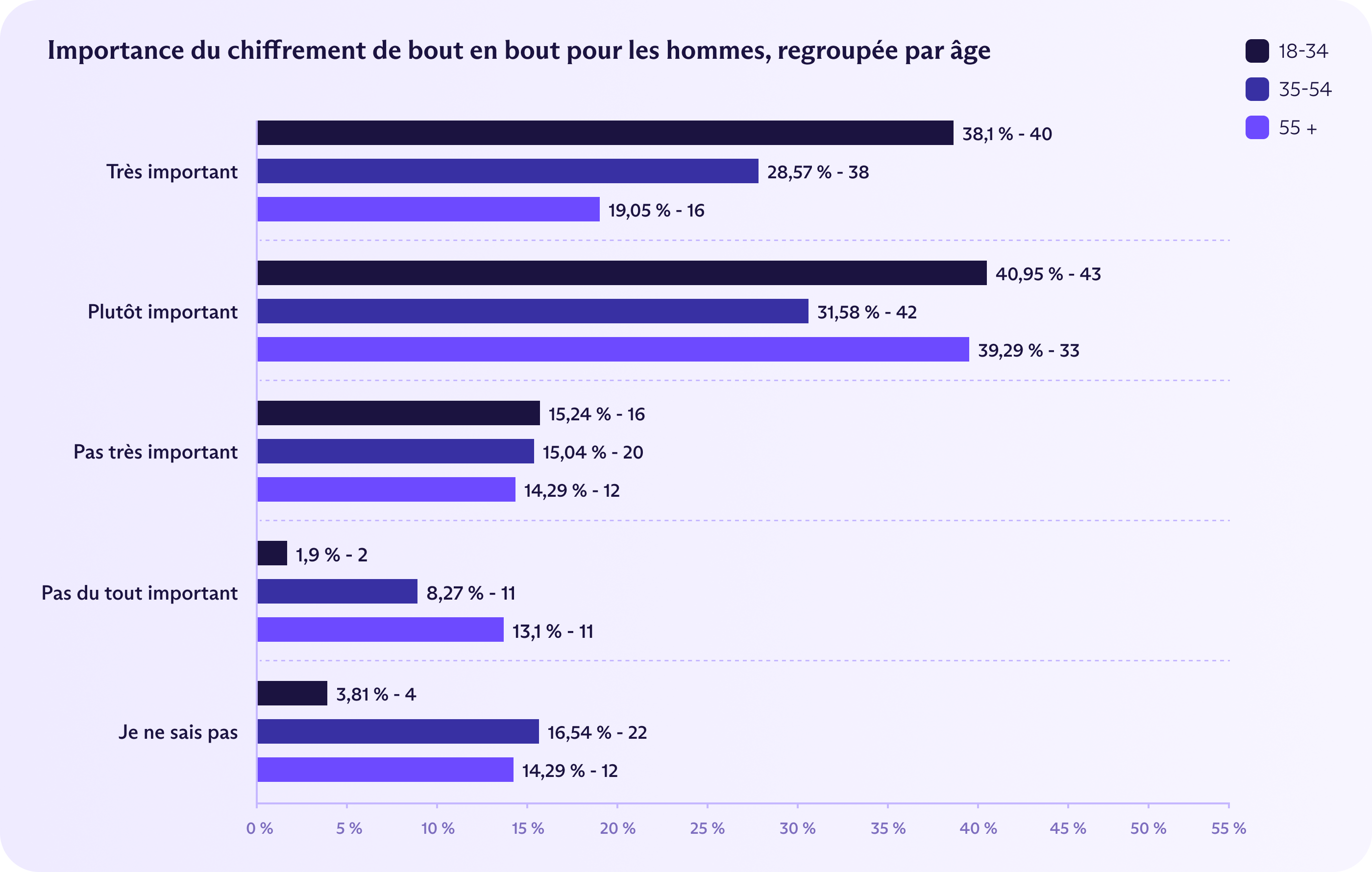 Des disparités marquées quant à l'importance accordée au chiffrement de bout en bout apparaissent selon l'âge. En France, les jeunes hommes semblent les plus fervents défenseurs de l'E2EE : 38 % des 18-34 ans le jugent « très important ». À l'inverse, seuls 19 % des hommes de plus de 55 ans le considèrent comme « très important ». Les femmes de 18-34 ans se montrent également relativement peu enthousiastes, avec seulement 21 % d'entre elles qui le jugent très important. Pour les autres tranches d'âge, les résultats se situent entre 25 et 32 %.