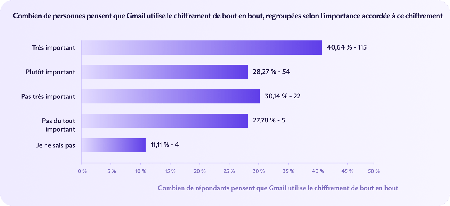 Google a grandement bénéficié des idées fausses du public sur la sécurité et le respect de la vie privée. Les personnes qui considèrent l'E2EE comme très important étaient en fait plus susceptibles de dire que Gmail utilisait l'E2EE que la personne moyenne de notre enquête (45 % contre 33 %). Ce même groupe était également plus enclin à considérer Gmail comme un service privé : 30 % l'ont qualifié de « très privé » et 34 % supplémentaire le qualifiant de « relativement privé ».
