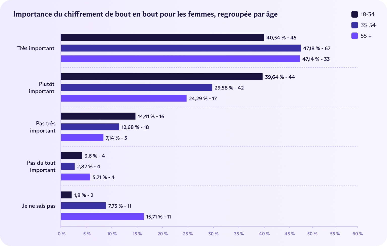 Cependant, 47 % des femmes âgées de 35 à 54 ans et des femmes de plus de 55 ans ont déclaré que l'E2EE était important, bien plus que les hommes de plus de 55 ans (37 %) ou les femmes de moins de 34 ans (41 %).