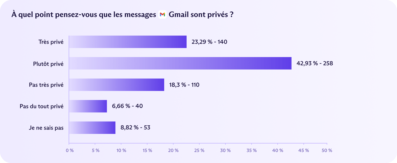 En fait, les Allemands étaient les plus à l'aise avec les protections du respect de la vie privée de Gmail. Dans l'ensemble, 66 % des Allemands pensent que leurs messages Gmail sont « très » ou « assez privés », le niveau de confiance le plus élevé parmi les pays étudiés, suivis par les États-Unis à 61 % et le Royaume-Uni à 57 %. Ironiquement, le pays qui accorde le moins de confiance à l'E2EE, la France, a également le moins de confiance en Gmail, avec seulement 48 % des répondants français déclarant que leurs messages étaient au moins assez privés.