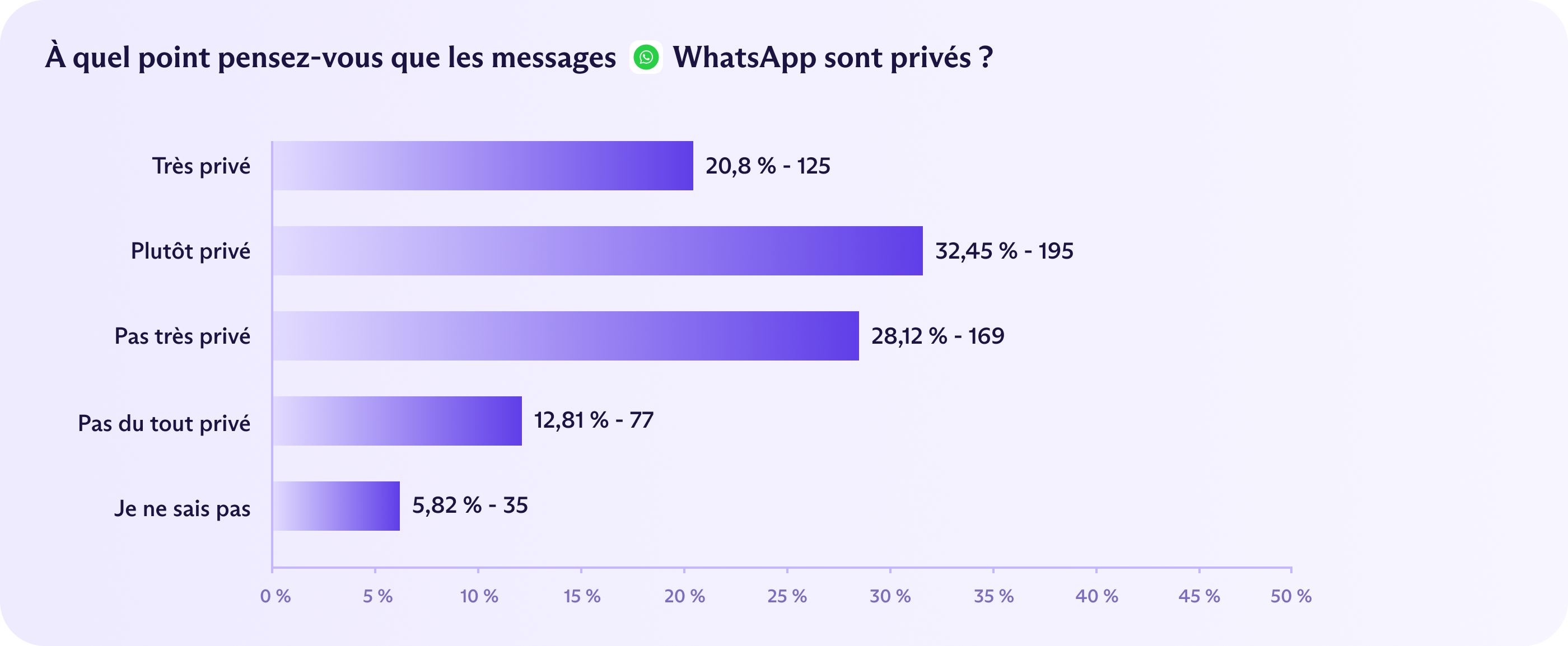 Malgré ces faits, 53 % des Allemands ont tout de même déclaré que WhatsApp était « très privé » ou « assez privé » et seulement 51 % ont déclaré qu'ils envisageraient de passer à un service de messagerie plus privé.