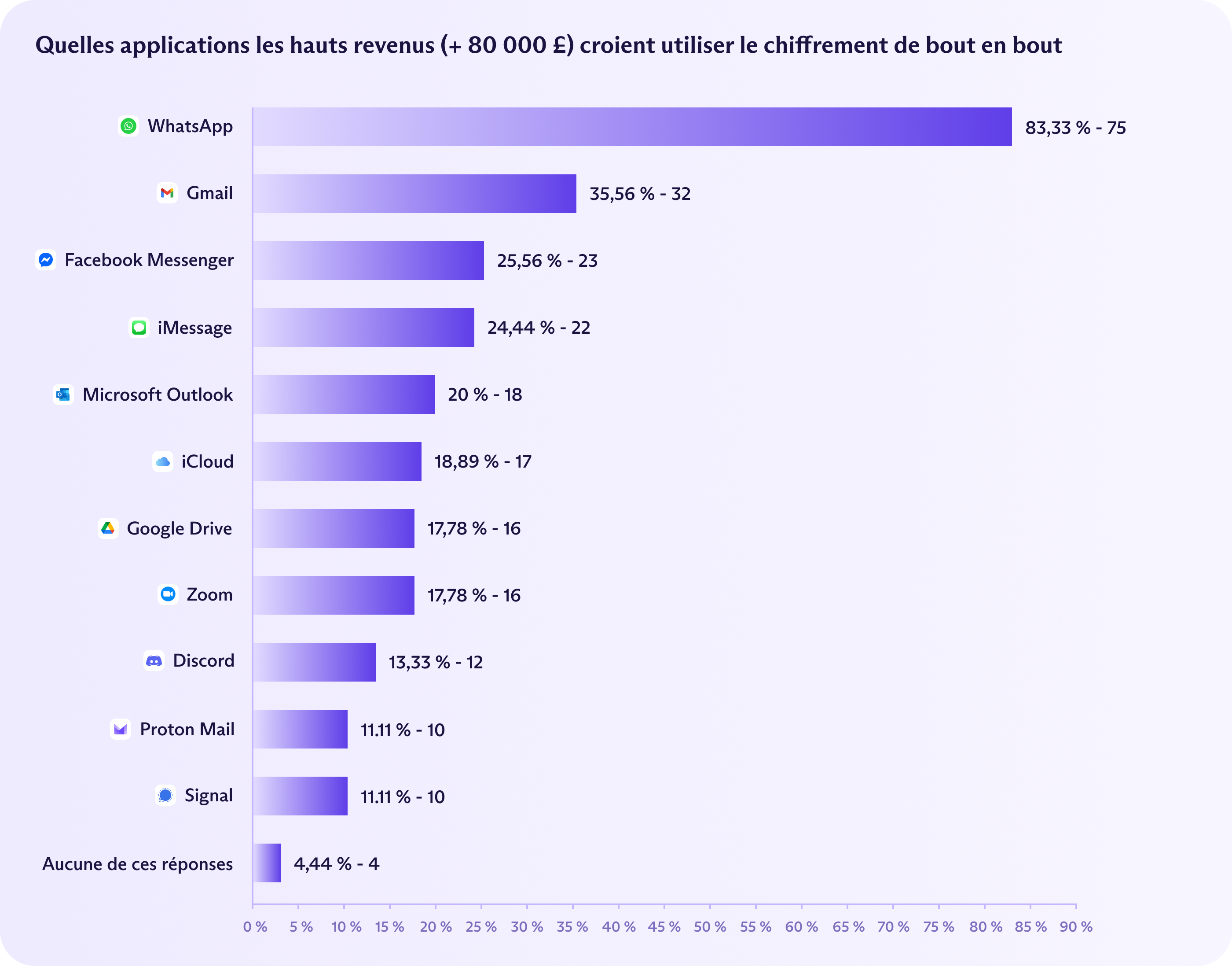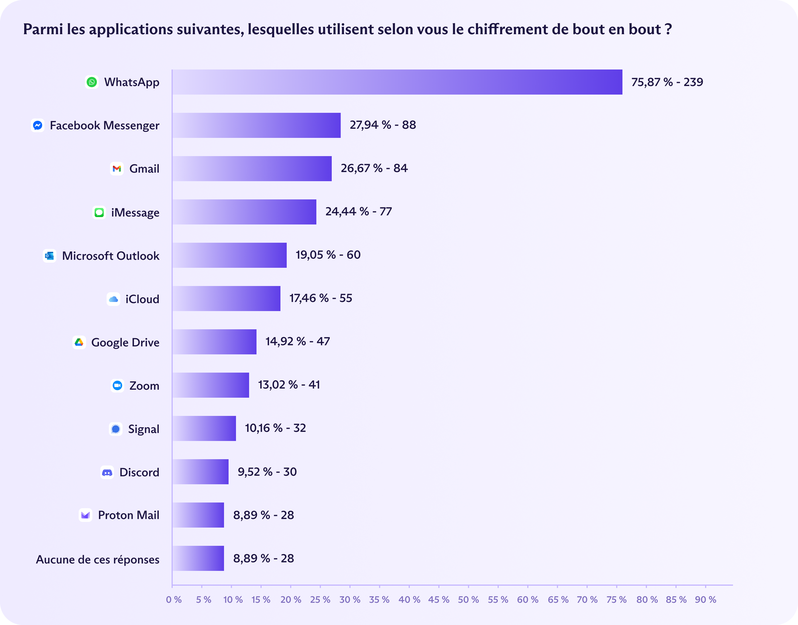 - 83 % croyaient que WhatsApp utilisait le chiffrement de bout en bout (correct)