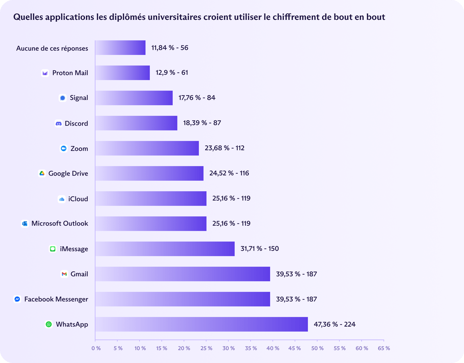 Mais lorsqu'il s'agissait d'identifier correctement quels services offrent l'E2EE, les chiffres racontaient une autre histoire. Parmi les répondants ayant fait des études universitaires :
