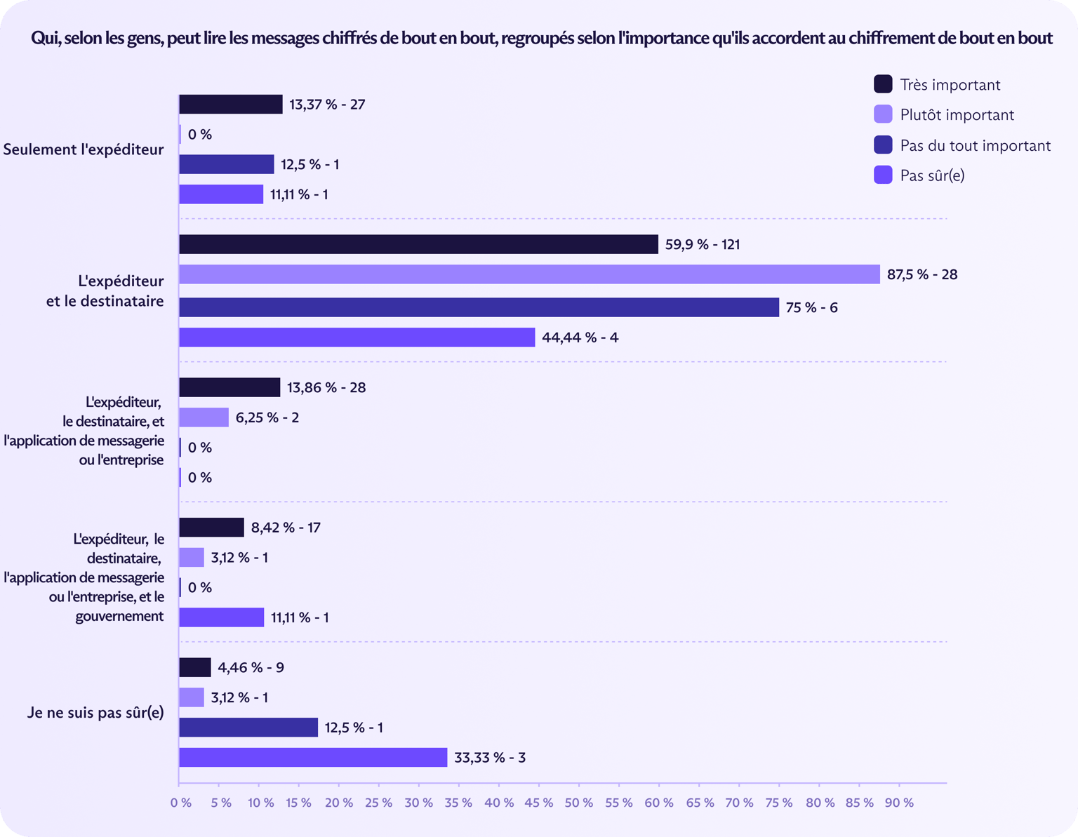 Plus d'un tiers des Américains ayant déclaré que le chiffrement de bout en bout (également connu sous le nom d'« E2EE ») était très important ont tout de même répondu de manière incorrecte lorsqu'on leur a demandé qui pouvait accéder aux messages chiffrés de bout en bout. Certains croyaient que les fournisseurs d'applications et le gouvernement pouvaient encore les lire. 5 % de plus ont déclaré ne pas en être sûrs. Plus alarmant encore, un grand nombre de personnes a identifié de manière incorrecte des services comme Gmail et Discord comme offrant le chiffrement de bout en bout, alors que ce n'est pas le cas.
