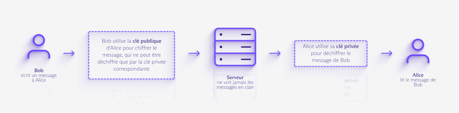 Le chiffrement de bout en bout utilise la cryptographie asymétrique pour garantir que seul le destinataire prévu peut déchiffrer vos données. Chaque utilisateur possède une clé publique (pouvant être partagée en toute sécurité) et une clé privée (gardée secrète sur son appareil).