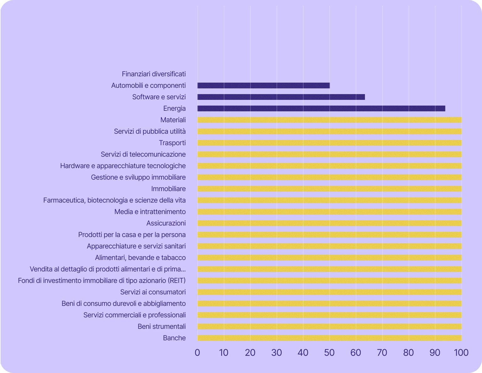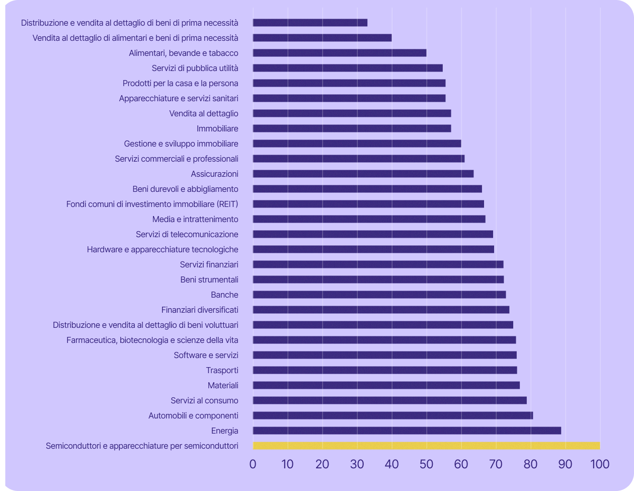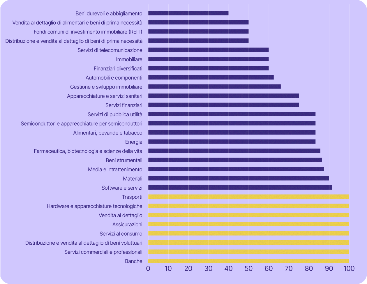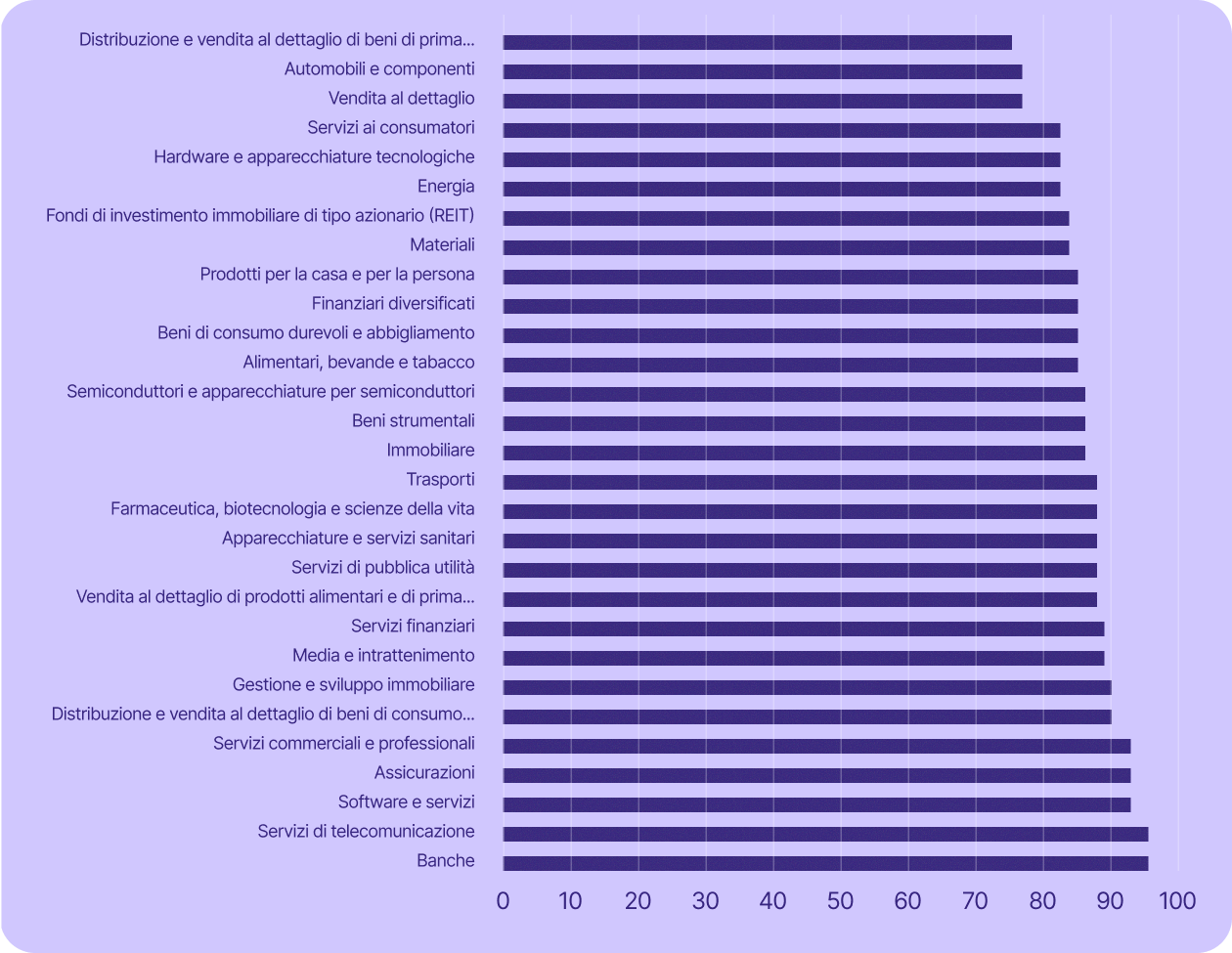 Alcuni dei settori più critici per l'economia svizzera sono ancora più esposti. Il settore dei servizi, che include banche, finanza, assicurazioni e servizi professionali (tra gli altri), ha rappresentato il 70% del PIL del Paese nel 2023 e ha impiegato il 78% della sua forza lavoro nel 2024. In tutti questi settori (ad eccezione di quello bancario), almeno il 67% delle aziende quotate in borsa utilizza tecnologia statunitense.