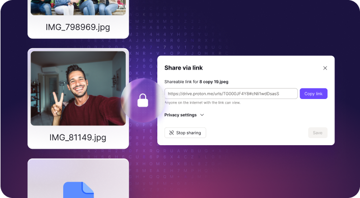 Con Proton Drive puoi condividere foto tramite link per la condivisione di file sicuri, impostare password o date di scadenza e revocare l'accesso in qualsiasi momento.