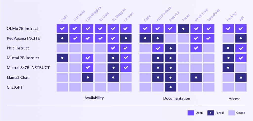 Conversely, Meta or OpenAI, for example, have a very different definition of “open” to AllenAI(新しいウィンドウ) (the institute behind OLMo 7B Instruct). These companies have made their code, data, weights, and research papers only partially available or haven’t shared them at all.