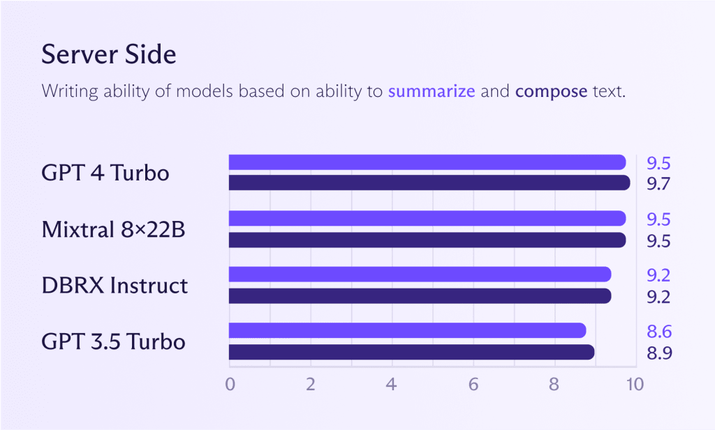 While the models mentioned earlier for on-device can also work server side, it typically makes sense to run more powerful models to get better performance (should you need it). Looking at the graph below, you will see how Mixtral 8x22B models compare with GPT 4 Turbo or GPT 3.5 Turbo. If you want ChatGPT-level model performance, you can already get very close to it.