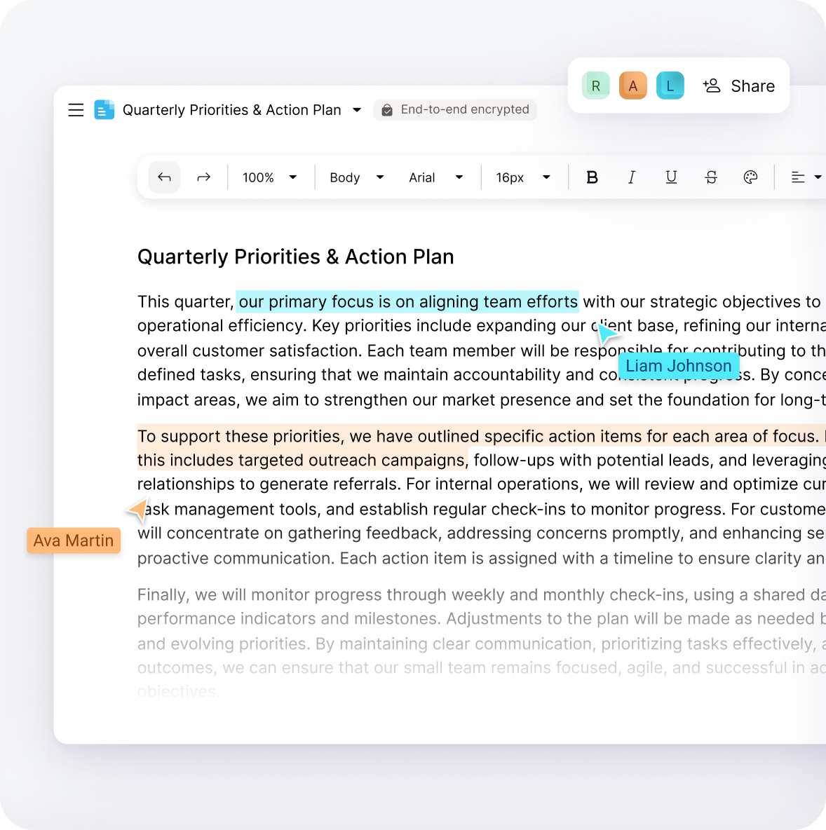 編集、フィードバックの共有、フォルダーの管理を顧客や同僚と行うことができます。相手がProtonアカウントを持っていなくても問題ありません。 更新はリアルタイムで同期されるため、どこにいても全員が同じ情報を共有できます。