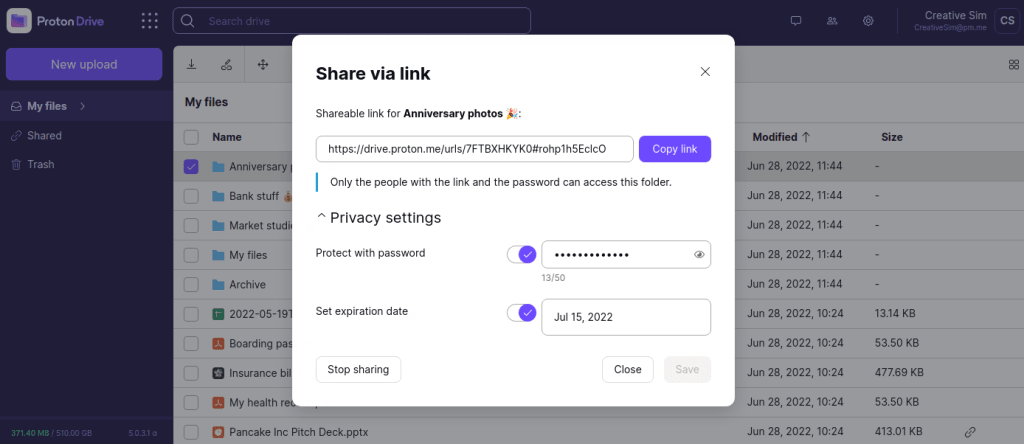 - With Proton Drive, you can back up and store sensitive legal documents in end-to-end encrypted cloud storage. Plus, you can securely share files with password protection, set expiration dates, and manage access permissions to prevent unauthorized access. Proton Docs allows you to create online documents and collaborate securely through built-in editing, commenting and suggesting tools.