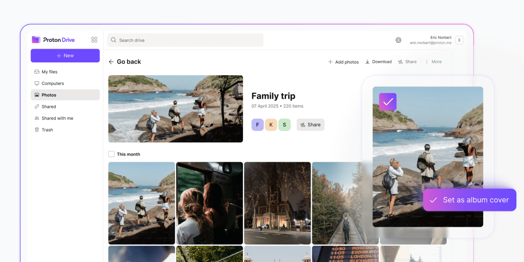 Highly requested by our community, this new feature enhances Proton Drive’s existing secure file and photo storage experience. Albums lets you manage your memories with ease and privacy — all while continuing to protect your files with Proton’s industry-leading privacy and security safeguards. The only people who can access your images are you and the people you choose.