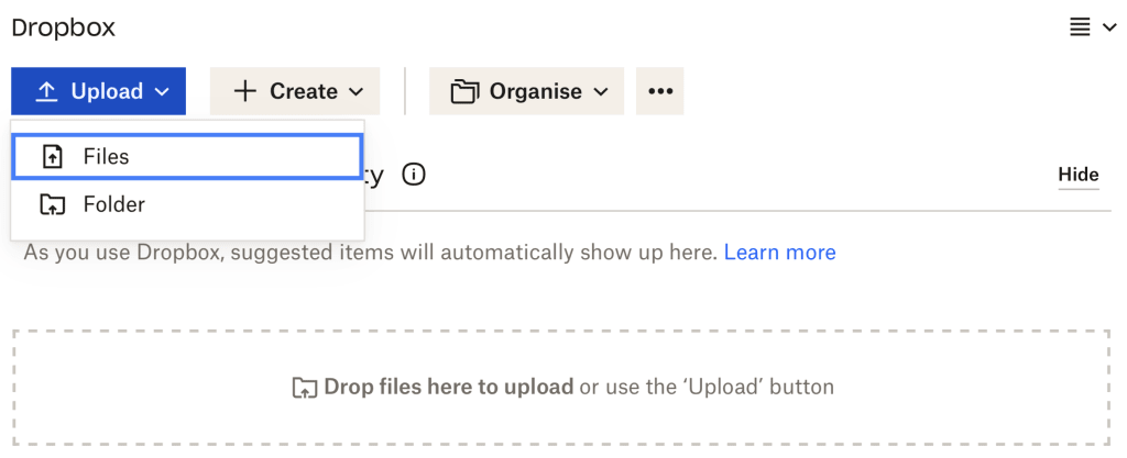 - Click Upload and select Files or Folder. Alternatively, you can also drag and drop files from your desktop to Dropbox.