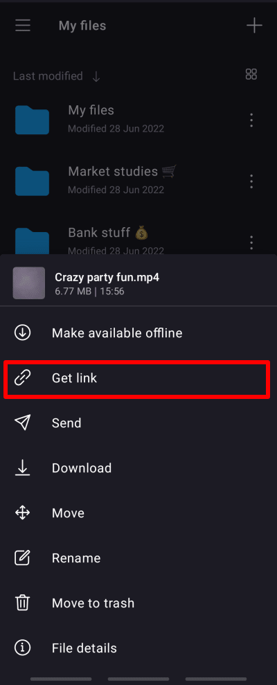 - Once your file is uploaded, tap the three vertical dots next to the file name and tap Get link.