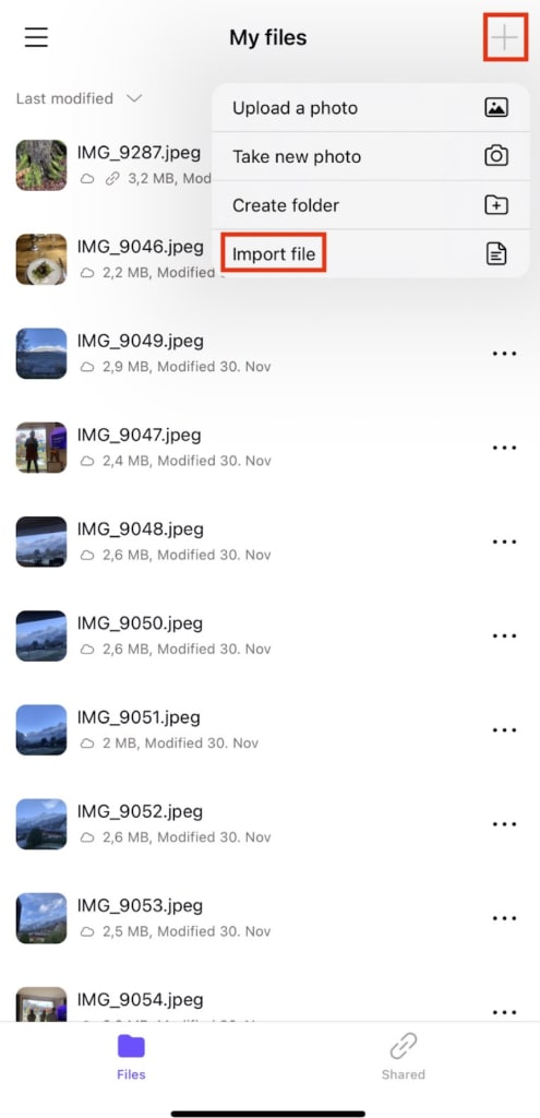 - Select + at the top right and tap Import file.